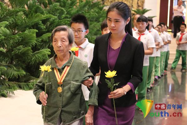 启动仪式上,抗战老战士徐爱民和部分学生代表向抗战英烈献花。中国青年网记者 李川 摄