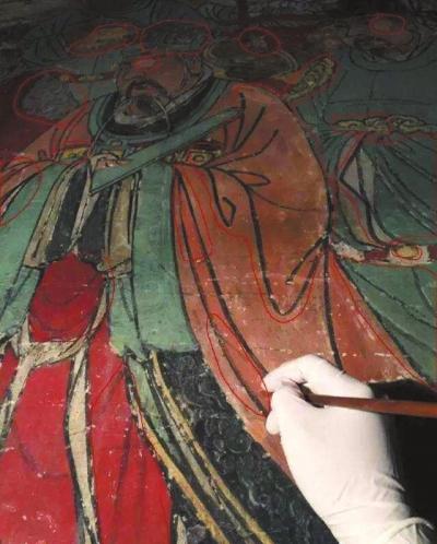 据了解,广胜寺壁画彩塑修复工程包括:对寺内的壁画及彩塑进行起甲修复、颜料层粉化修复、裂隙修复、表面清污等工作。