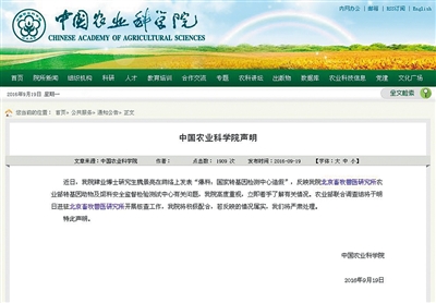 昨日下午,中国农业科学院在其官方网站发表声明表示:我院肄业博士研究生魏景亮在网络上发表“爆料:国家转基因检测中心造假”,反映我院北京畜牧兽医研究所农业部转基因动物及饲料安全监督检验测试中心有关问题,我院高度重视,立即着手了解有关情况。农业部联合调查组将于9月20日进驻北京畜牧兽医研究所开展核查工作,我院将积极配合,若反映的情况属实,我们将严肃处理。