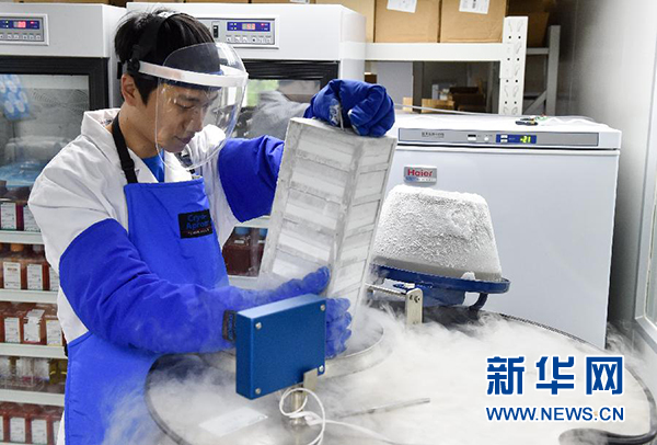 8月10日,国家基因库细胞存储平台中级实验师郑东敏将人源组织细胞样本经过培养,放入零下196摄氏度的液氮当中保存。新华社记者毛思倩摄