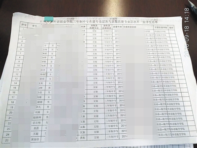 新京报记者注意到,在涉事学生提供的一份“在读专业层次与录取注册专业层次不一致学生名单”中,部分学生不仅改变了所学专业,甚至学制也由原先的三年制中专,变成了五年制大专。