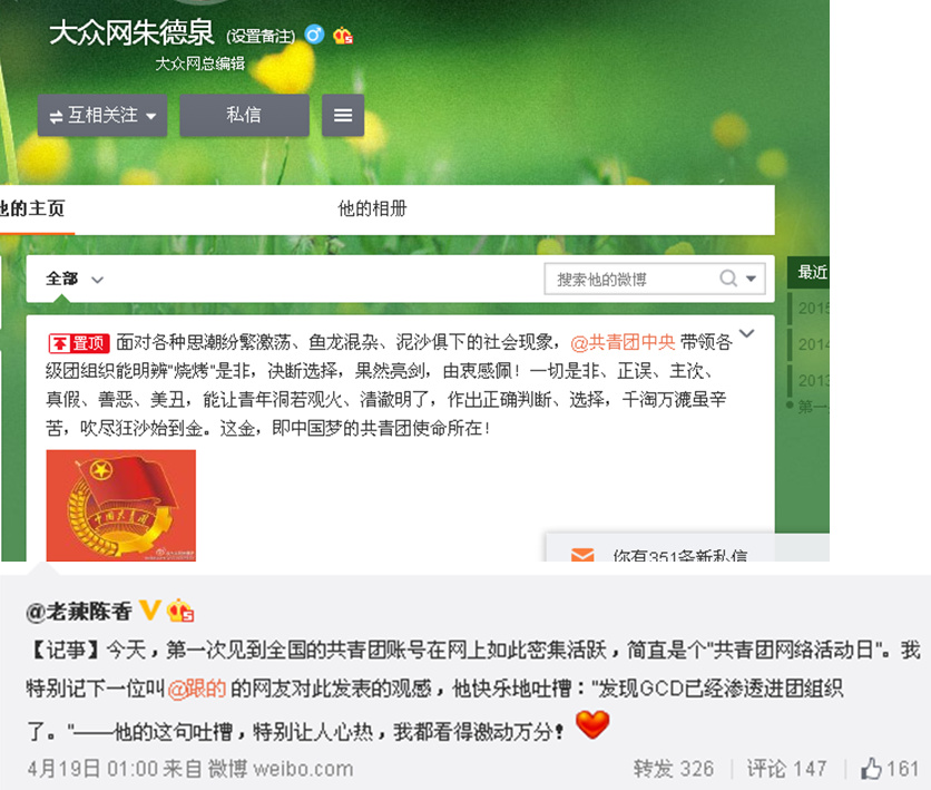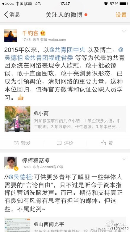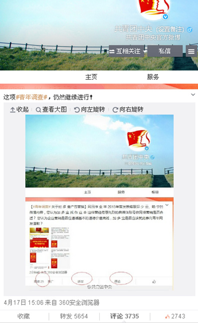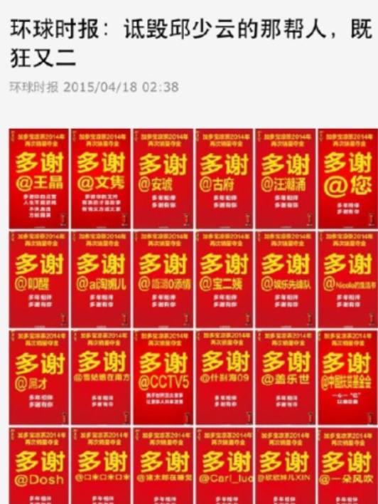 2015年4月17日,@共青团中央就加多宝是否应当道歉展开了一系列调查,但是这则调查发布后未经多久便遭到不明屏蔽,故团中央官方账号只得将原微博截图后继续发布。