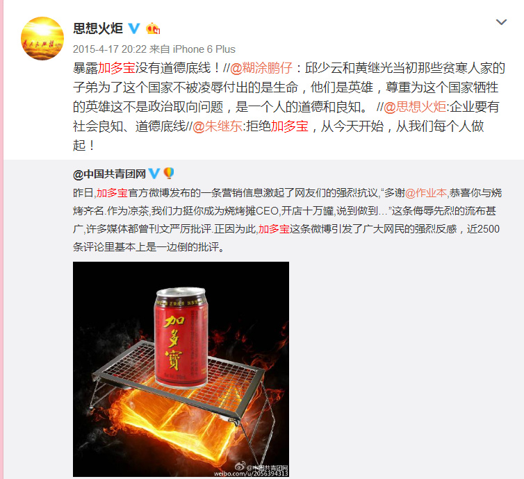 在我国,加多宝是一个比较为人所熟悉的凉茶品牌,然而在最近一年来,其却因涉嫌侮辱邱少云烈士而被推上风口浪尖。原因在于加多宝邀请曾将邱少云、赖宁等烈士污蔑为“烧烤”的微博用户@作业本 为其进行商业推广,并在对@作业本 的鸣谢图片中重提“烧烤”。(作业本正是因为侮辱烈士为“烧烤”而出名)。