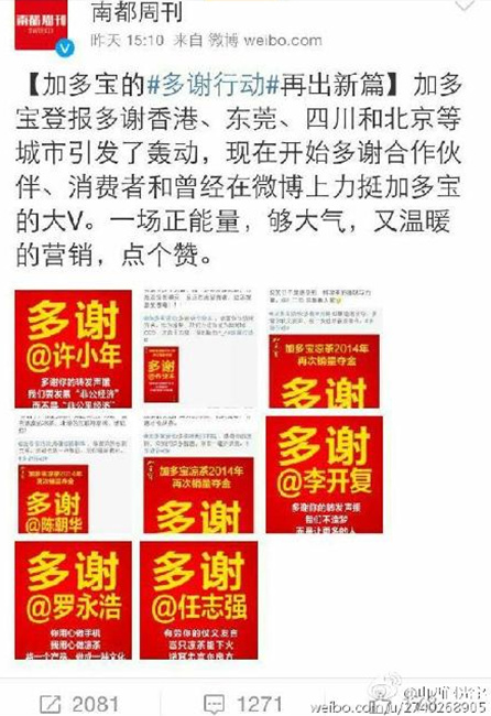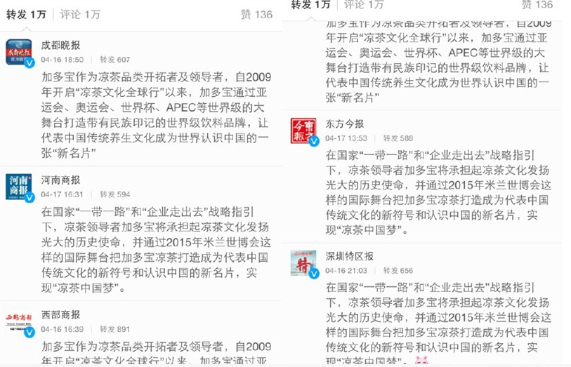 就在团中央微博遭到屏蔽的时候,多家都市类媒体却一同时间步调一致地发布有关加多宝的消息,画风如下↓↓↓