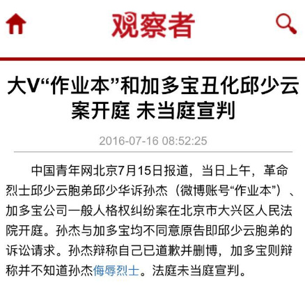 2016年7月,@作业本和加多宝丑化邱少云案正式开庭,此时@作业本与加多宝方面仍然抱着不承认的态度为自己辩解,当时,法庭并未公开宣判。