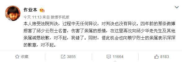 今天上午11:13,@作业本通过微博发布道歉声明:
