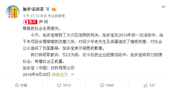 在去年,邱少云的胞弟邱少华将用户@作业本 与加多宝诉至法庭,要求其为侮辱烈士的行为赔礼道歉。今天,受理此案的北京大兴区人民法院对这一案件作出宣判:判决被告于判决生效后3日内发布公开赔礼道歉公告,并赔偿邱少云胞弟邱少华精神抚慰金1元。