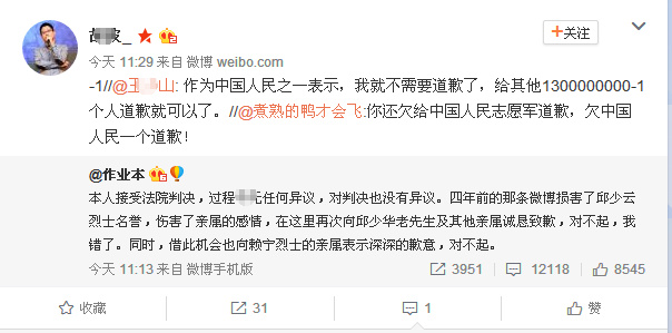 距离 @作业本 发布侮辱邱少云的微博已经过去了三年余,距离邱少华老人上诉也有了一年多的时间,今天,法庭的审判结果为英雄正名,也再次向社会传递出这样的信息——历史不容抹黑,英雄不容诋毁。