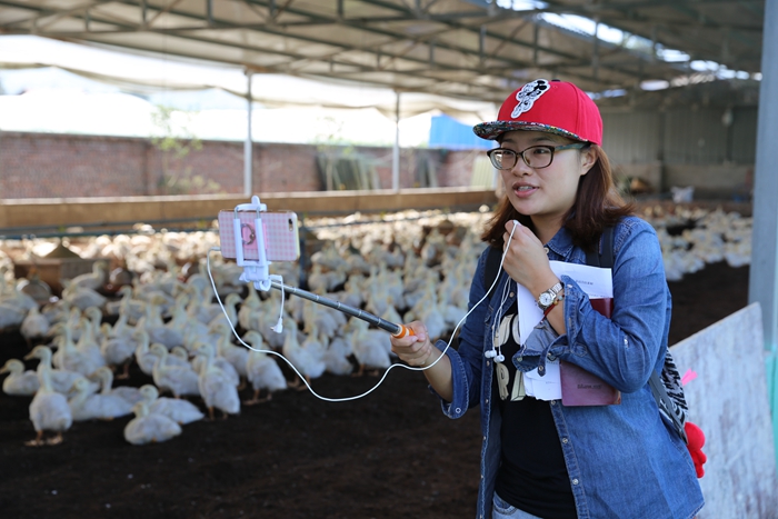 网易编辑许梦娜在红星村肉鸭养殖基地做直播。(中国网信网郭子涵 摄)
