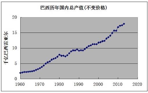 图4:巴西历年国内总产值(1960-2013年,不变价格,上图)外债占年国民收入百分比及年通货膨胀率(下图),数据来自世界银行和联合国统计司