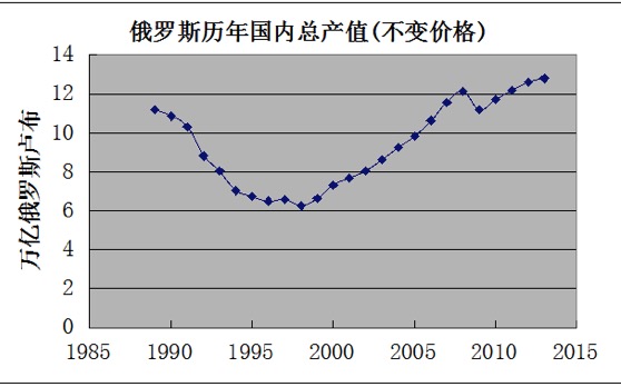 图5:俄罗斯历年国内总产值(1960-2013年,不变价格,上图)和年通货膨胀率(下图),数据来自世界银行