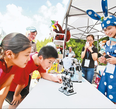 近日,在上海长风科普集市上,学生在未来生活馆里和机器人互动。