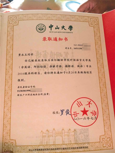 变故在5天后出现。8月10日,平昌县招办打电话称,经过复核,招生部门发现贾永玉户籍所在地为四川渠县,不应以平昌县生源的身份,获得中山大学的政策性加分。