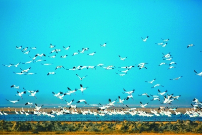 吉林西部湿地白鹤飞翔。潘盛昱摄/光明图片