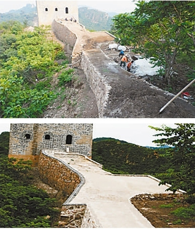 国家文物局2014年印发的《长城保护维修工作指导意见》指出:“长城保护维修必须遵守不改变文物原状和最小干预的原则。”“长城保护维修必须保持长城的原形制、原结构,优先使用原材料、原工艺。”“不得采用水泥及未经室内实验和现场试验证明可靠、安全、有效及可再实施性的化学材料或工艺进行长城结构加固或表面防风化加固处理,避免形成新的安全隐患。”