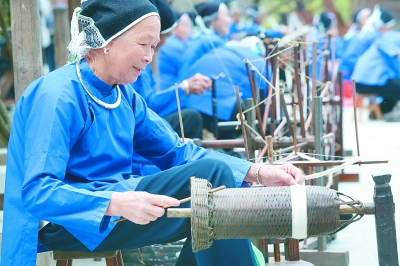通道县侗族群众在皇都侗族文化村表演侗族织锦纺线技艺。本报记者 赵洪波摄/光明图片