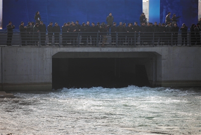 2014年12月27日,南水北调中线一期工程总干渠终点团城湖明渠开闸放水,北京市南水北调正式通水。新京报记者 薛珺 摄