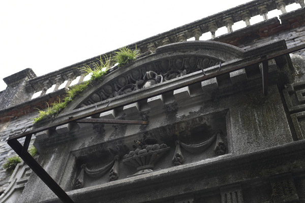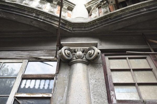 沈洪生打开大门中的小门,弧形的阳台与宝瓶柱围栏,形成了天井独特的仰望视野。只要一进门便可见,8根直径约40cm的羊角型罗马柱贯穿与两层楼之间。一楼中央为大客厅,东西各一个30多平米的卧室,大客厅除了有雕刻着“八仙过海”的8扇中式雕花落地长窗,房顶上还镌刻有西式的繁复精美花纹顶角线和吊灯圈。