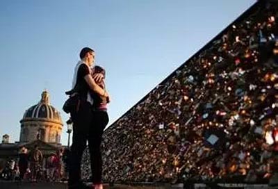 每年全世界都有数万对恋人来到法国塞纳河畔的艺术桥,拿出刻着两人名字和相爱誓言的小锁,将其锁在桥的栏杆上,然后把钥匙丢进塞纳河,以此表示两人的爱情之锁永远不再打开,祈祷这份爱情可以天长地久。