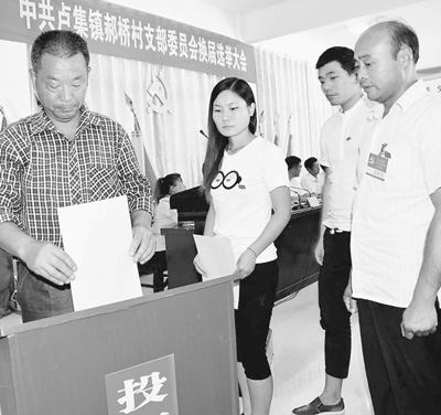 图为泗阳县卢集镇郝桥村党员正在为选出心目中的“当家人”投上庄严的一票。