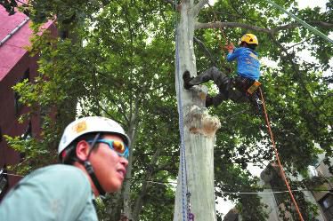 刘戈说,他的专业其实是攀岩,与攀树看上去一样,但里面还是有些区别的,为此,他跟着陈超学了两个星期。