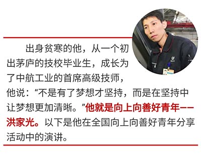 或许刚开始,我的努力只是为了证明自己的价值,证明“寒门可以出贵子”,但现在早就不止是这样了。今年,李克强总理在政府工作报告中也提到要“培育精益求精的工匠精神”。我的岗位看似平凡,可是也关系着祖国的航空事业,关系到每个飞行员兄弟的生命。