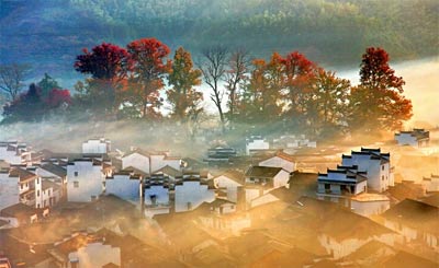 位于上饶市婺源县古坦乡,秋季的婺源,满山的红叶,在晨雾中与古徽州特色的白墙灰瓦高均在35米以上,村庄建筑相映成趣,宛如一幅意境绵长的古画。特别是在石城,百余棵种植年代久远的枫树,高均在35米以上,巨大的枫树林一片火红。