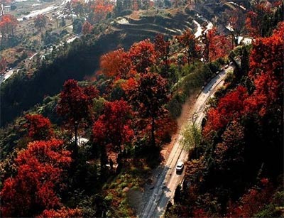 位于吉林市长白山,这里林木茂盛,沿两岭之间不时有村落、稻田、小溪山水水绵延100多公里的红叶林、白桦林,装点出美丽多姿的风光画卷。最佳赏红季节是在每年10月的中旬之前,主要有红叶溪、爱林林场、五彩路等,红叶满天,五彩斑斓。(来源:今日头条)