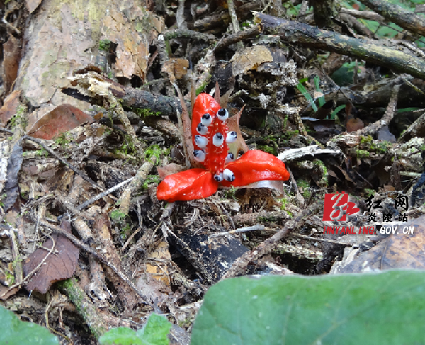 9月28日,笔者从湖南炎陵县林业局获悉,日前炎陵县几位摄影协会成员,深入炎陵县神农谷腹地的碛脑采风,一朵奇特的野“花”从枯枝落叶中映出。鲜红的花瓣,夹杂着几粒白中带黑的果实,像鱼的眼珠,惹人喜爱。当地向导郭忠林介绍说,这是野生姜,下面还有姜块。