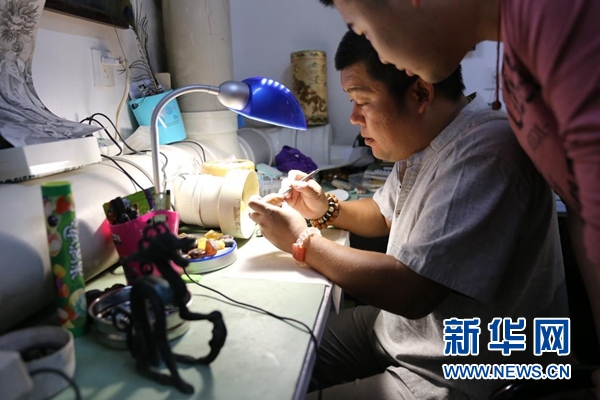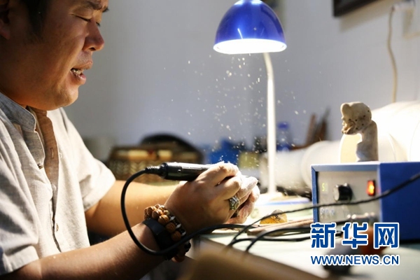 陈焕升在雕刻琥珀(李旭摄)