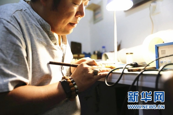 新华网北京9月29日电(记者 李旭)一把雕刻刀、一颗琥珀,他在工作室里专心于创作。80后的他身量微胖,声音洪亮,坐在记者对面手拿雕刻刀在琥珀上雕刻纹样,厚薄有度,刚柔相济,精致的纹案慢慢显现出来。每一块琥珀都是大自然的精灵,而琥珀雕刻的背后凝聚着中国匠人的坚守、热枕和执着。