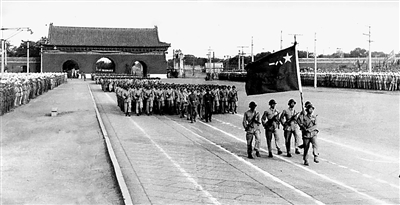 6月15日,中央军委发出了关于颁布军旗的“命令”:“中国人民解放军军旗为红地,上缀金黄色的五角星及‘八一’两字”,“表示中国人民解放军自1927年8月1日南昌起义诞生以来,经过长期奋斗,以其灿烂的星光普照全国”……