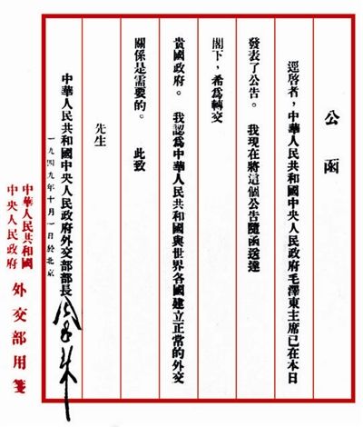 “中华人民共和国中央人民政府毛泽东主席已在本日发表了公告。我现在将这个公告随函送达阁下,希为转交贵国政府。我认为中华人民共和国与世界各国建立正常的外交关系是需要的。”
