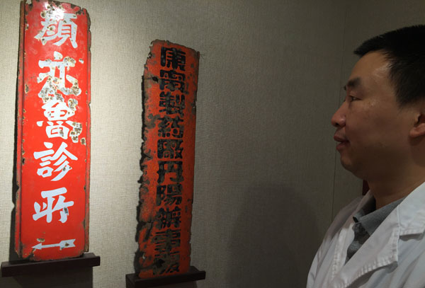 图为上海市第十人民医院中医科医生在观看已有约百年历史的颜亦鲁诊所招牌 吴宇摄