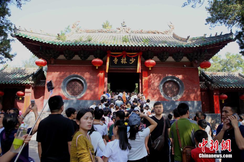 10月4日,国际知名旅游景区河南登封嵩山少林寺进入黄金周客流高峰期,前来游览少林寺的民众人潮涌动。据了解,目前嵩山少林寺景区的日接待量已超5万人,因景区事先精心筹备合理分流,现场秩序井然有序。 中新社记者 王中举 摄
