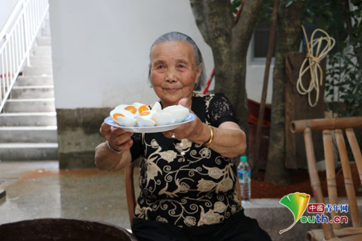 在江西省瑞金市壬田镇凤岗村,廖秀英老人展示其制作的咸鸭蛋。中国青年网记者李川 摄
