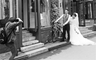 同样是老北京胡同,相比于南锣鼓巷和烟袋斜街的喧嚣,北京青年报记者发现紧邻热门景区的五道营胡同和杨梅竹斜街可谓“闹中取静”。因为游客少,店铺装饰又颇具特色和时尚,两条胡同成为很多游客的“拍照圣地”,甚至还有市民专门来此拍摄婚纱照。