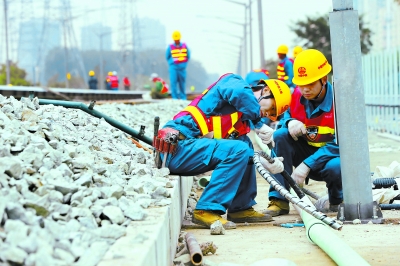 昨天下午,施工人员在北苑路北延施工现场安装线路照明设备,为地铁十三号线恢复运营前的冷、热滑试验作准备。本报记者 孙戉摄