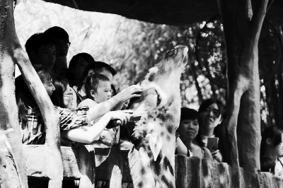 10月6日,广东佛山,广东长鹿旅游休博园是岭南旅游界的新星,今年国庆黄金周假期,每天平均接待入园游客3万多人次。有少部分游客则对动物园的规定视若无睹,为了与美丽的长颈鹿拍张零距离的近照,竟然几个人用手掰着长颈鹿的犄角,让长颈鹿的脸贴着自己的脸来合影自拍。这种现象每天都时有发生,动物园内的管理员每天要制止很多次。长颈鹿给这些游客弄得直翻白眼,这种行为极易造成长颈鹿脊柱扭伤。 东方IC供图