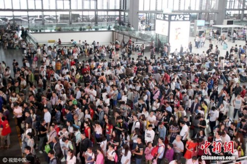 2016年10月6日,江苏省苏州市,随着国庆长假接近尾声,外出游玩、探亲的旅客陆续返程,江苏苏州火车站迎来返程客流高峰。 王建康 摄 图片来源:视觉中国