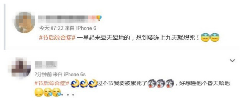 自2015年2月至今,新浪微博“#节后综合症#”的话题主页持续有新帖发布,总阅读量超过1000万。节后第一天尚未到来,已经有网友发帖抱怨“一早起来晕天晕地的”“好想睡他个昏天暗地”。