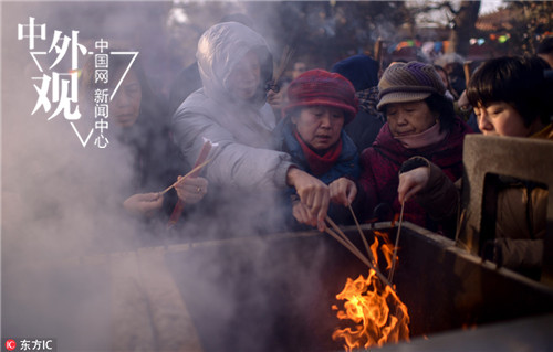 2016年2月8日,中国北京,丙申猴年大年初一,北京雍和宫内祈福敬香的市民人潮涌动。当日,雍和宫向每位入寺的市民免费发放“环保香”,有效减少烟尘等污染物排放。每年正月初一,众多香客都会前往雍和宫敬香祈福,希望一炷香能讨个好彩头。京华时报 / 东方IC