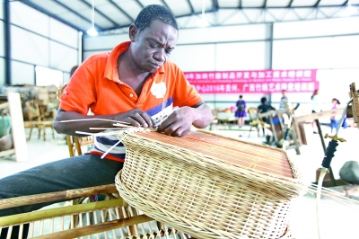 10月6日,在四川省青神县中国竹艺城,一名加纳学员自己编制的竹编产品。来自非洲的19名学员,从8月15日起在“中国竹编艺术之乡”——四川省眉山市青神县参加为期两个月的竹编技术培训。