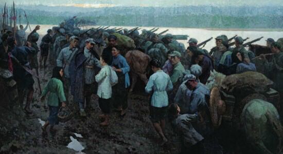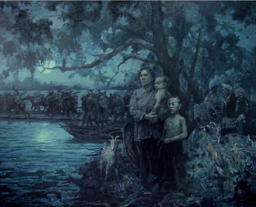 油画《于都雨夜》,作者:李如 一位妇女带着孩子在渡口眺望过河的红军部队,不知丈夫是否在队伍中