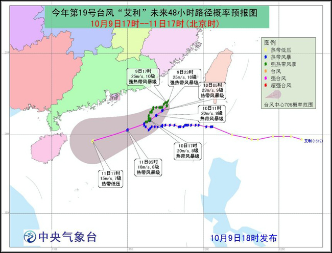 张玲:今年第19号台风“艾利”的中心9日上午10点位于香港东偏南大约345公里的南海东北部海面上。10月9日“艾利”仍将在南海东北部海面徘徊少动,强度维持或略有增强,预计,10日早晨以后将以每小时10至15公里的速度向西偏南方向移动,逐渐向海南岛以东海面靠近,强度逐渐减弱,并将于11日在海南岛东部海面减弱为热带低压或消失。
