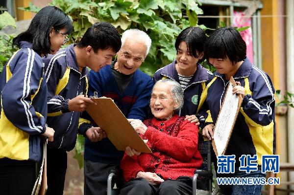 10月9日,河北省宁晋县第五中学美术班的学生来到102岁的老人王俊(右三)家中,为她画像并展示作品。当日是重阳节,各地举行丰富多彩的敬老爱老活动。 新华社记者 牟宇 摄
