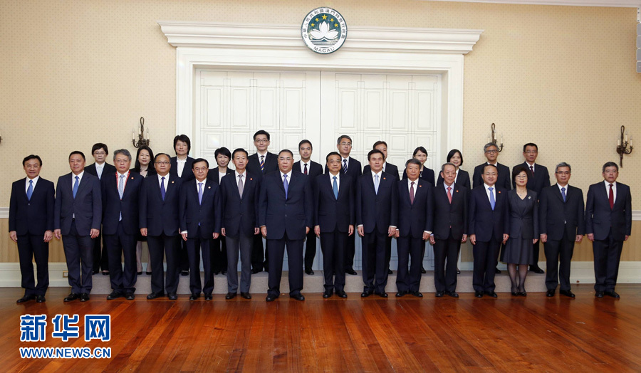 10月10日,国务院总理李克强在澳门特别行政区行政长官崔世安陪同下,来到特区政府总部视察。这是李克强与特区政府各司局长合影。新华社记者 鞠鹏 摄