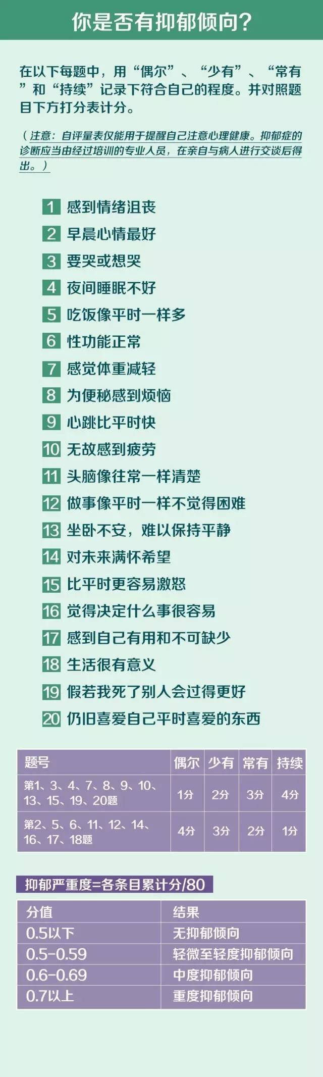 以下是美国权威抑郁自评量表,选择符合自己的程度――偶尔、少有、常有和持续。需注意,自评量表用于评价一下自己的心情,提醒自己注意心理健康是可以的。抑郁症的诊断应当由经过培训的专业人员,在亲自与病人进行交谈后得出。