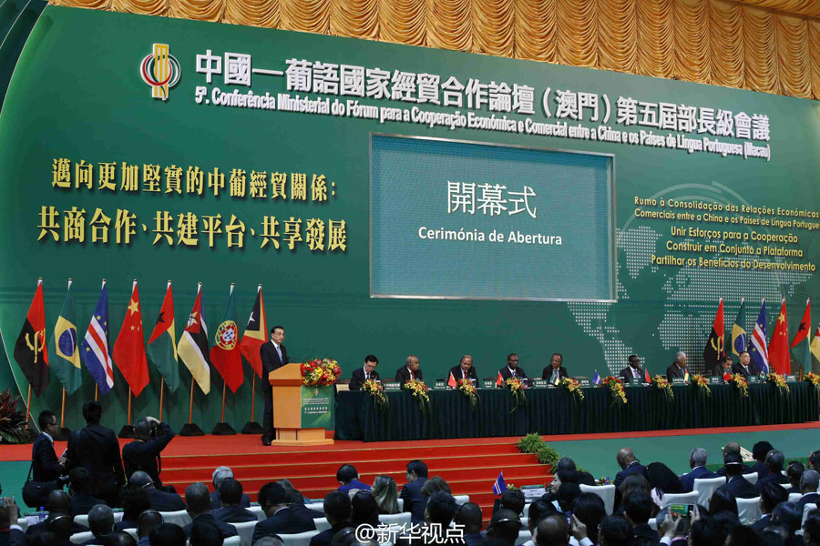 李克强总理11日上午在澳门出席中国—葡语国家经贸合作论坛第五届部长级会议开幕式并发表主旨演讲。葡萄牙、佛得角、几内亚比绍、莫桑比克等国总理及巴西、安哥拉、东帝汶等国政府代表出席。开幕式前,李克强与各国代表团团长集体合影。(据新华视点微博报道)