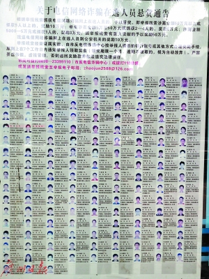 这个人口刚过100万的旅游城市,常年贴在大街小巷上的电线诈骗悬赏人员就有接近150名,反电信诈骗的标语比比皆是,甚至举报重大线索的群众可获得50万元奖金。在这儿,你很有可能与一位从未出过远门,却操着一口口音浓重的普通话,远程指挥别人如何进行“机票退改签”的诈骗者擦身而过。